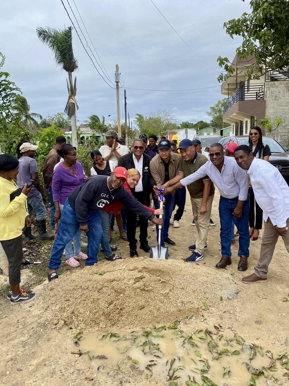 El Alcalde Juan Rafael Ventura, acompañado del señor Jesús Jiménez Mota, encabezó este día el primer picazo que deja formalmente iniciados los trabajos de construcción de aceras y contenes en el barrio Los Arrocitos, del municipio.