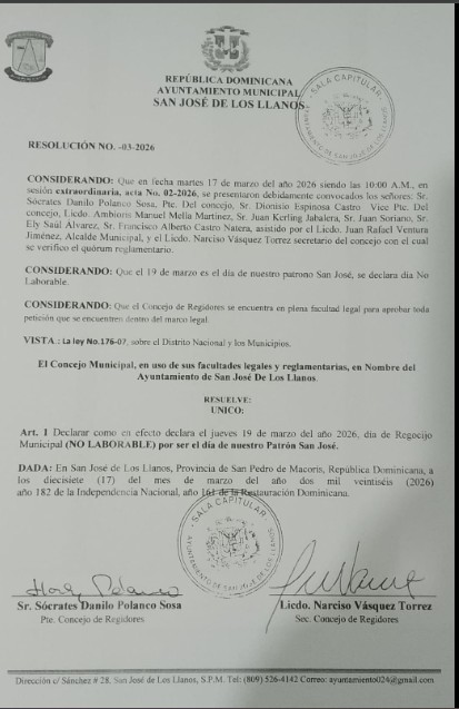 Art. 1 Declarar como en efecto declara el jueves 19 de marzo del año 2026, día de Regocijo Municipal (NO LABORABLE) por ser el día de nuestro Patrón San José.